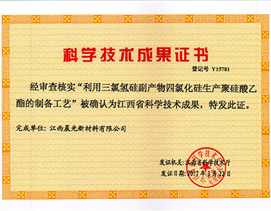 “一種表面含硫硅烷修飾的二氧化硅微球及其合成方法”被江西省科學(xué)技術(shù)廳授予“江西省科學(xué)技術(shù)成果”榮譽(yù) “利用三氯氫硅副產(chǎn)物四氯化硅生產(chǎn)聚硅酸乙酯的制備工藝”被江西省科學(xué)技術(shù)廳授予“江西省科學(xué)技術(shù)成果”榮譽(yù) “3-氯丙基三烷氧基硅烷清潔生產(chǎn)方法”被江西省科學(xué)技術(shù)廳授予“江西省科學(xué)技術(shù)成果”榮譽(yù) 湖口縣安全生產(chǎn)委員會(huì )授予“2016年度全縣安全生產(chǎn)工作先進(jìn)單位”榮譽(yù) |